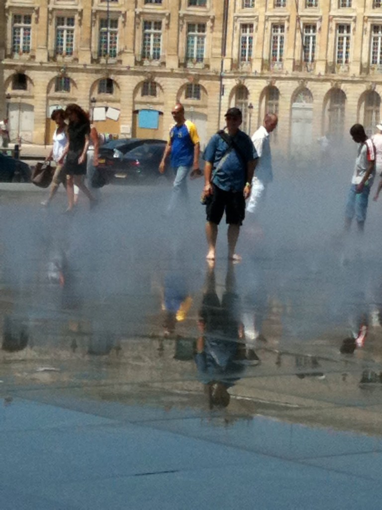 Au centre de la place, sur les quais, le « miroir » était fort populaire. Il s’agit d’une piscine de deux centimètres d’eau qui agit comme un miroir sous le soleil éclatant. Toutes les 15 minutes environ, des jets d’air poussent une brume à la hauteur de la taille. Aujourd’hui, le miroir faisait le bonheur de tous car on pouvait y marcher et même s’y asseoir.