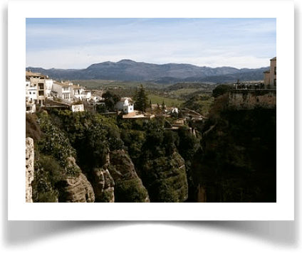 Ronda est à 60 kilomètres au nord de Marbella mais il faut faire 45 kilomètres sur une route qui grimpe jusqu’à 1100 mètres dans la montagne. Ce chemin de montagne longe continuellement les nombreux précipices formés par ces montagnes échancrées, les « sierra de las nueves« .