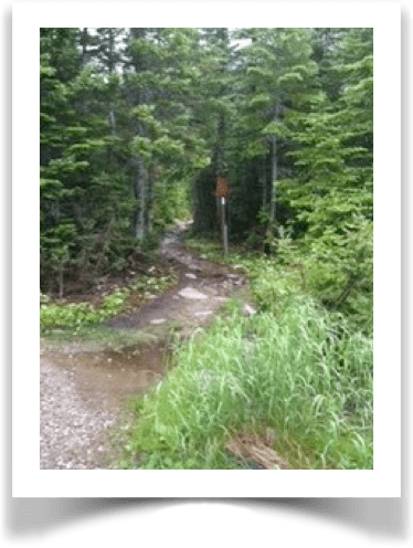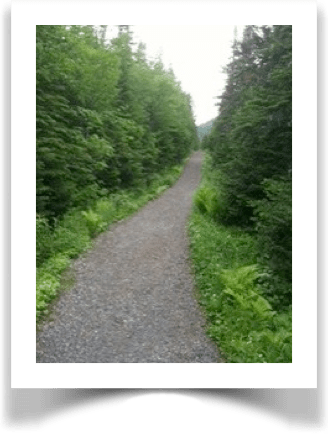 Je suis partie du Gîte du Mont Albert vers 09 h 30 et j’ai fait, en auto, les huit kilomètres qui séparent le Gîte du stationnement du Lac aux Américains. Déjà, il y avait apparence de pluie et j’ai mis mon imperméable avant de prendre le sentier très bien aménagé qui mène au lac. La piste, logée au fond d’un cirque glaciaire s’enfonce dans une forêt d’épinettes matures, très droits et bien fournis. La végétation de sous-bois est dense de chaque côté du sentier.