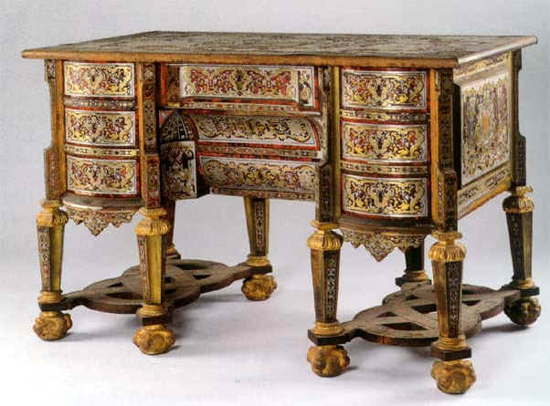 Au cours des derniers jours, nous avons appris à distinguer les ameublements des différentes époques. Nous avons particulièrement été impressionné par les bureaux Mazarin, l’ancêtre des bureaux de ministre, inventé par Mazarin, un ministre du roi Louis XIV. Mais plus particulièrement encore, nous avons admiré ces meubles fabriqués en marqueterie Boulle. Voici quelques sites web sur le style Louis XIV de la fin du 17e siècle.