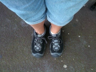 Voici les chaussures que j’ai portées pendant toute cette vadrouille ( 2010 et 2011). De bons souliers qui ont supporté mes pieds sur la roche, l’asphalte, la gravelle, la terre, le gazon, parfois sous la pluie, la plupart du temps sous le soleil, à la chaleur que comme au froid, à grimper et descendre des collines.