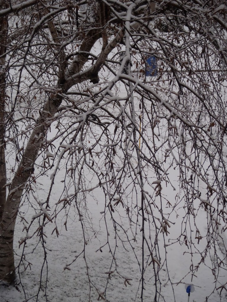 Quand j’ai rentré les paquets, l’arbre en face de chez nous a choisi ce moment pour se débarrasser de sa neige mouillée. Oups! Brr! Alors j’ai éclaté de rire. C’est Noël après tout!