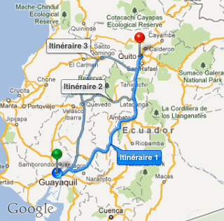 Cette petite recherche sur Guayaquil m’a permis de comprendre un peu plus l’Équateur. Par contre, j’ai quand même hâte de partir de cette ville chaude et humide et dont le trafic est ahurissant. Est-ce que quelqu’un peut m’expliquer pourquoi la ville persiste à mettre des lignes sur l’asphalte? Personne ne s’en préoccupe ici. Il y a trois voies mais cinq voitures se tiennent côte à côte …