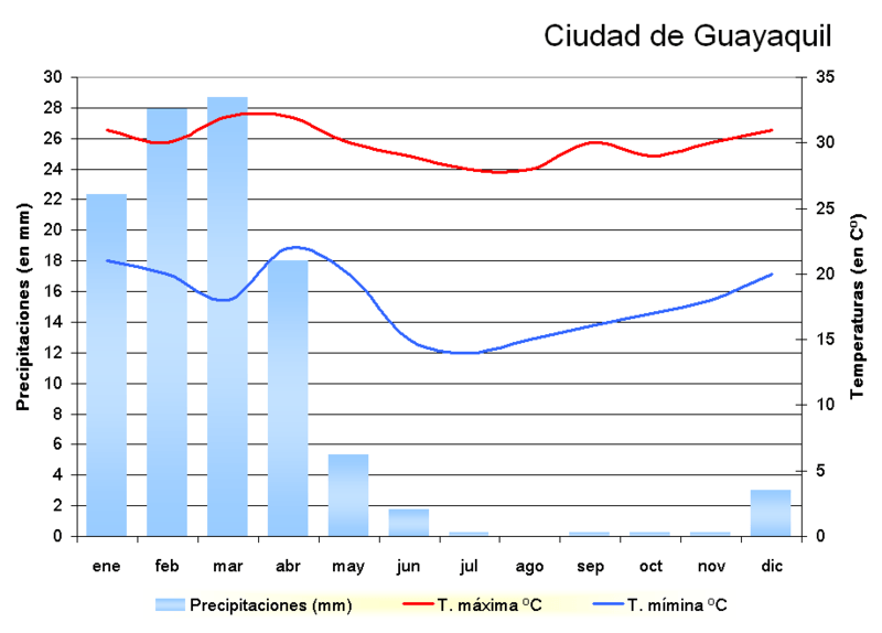 De par sa situation physique sur la côte et au sud du pays, Guayaquil jouit d’un climat tropical. Il y fait chaud. Par sa proximité de l’océan pacifique, la ville est balayée par deux courants marins puissants: le Humbolt, un courant froid et le El Niño, un courant chaud, lui donnent, contrairement au reste de l’Équateur deux saisons. L’été austral, la saison des pluies, apporte de la pluie et de l’humidité entre décembre et avril. L’hiver austral, une saison sèche, dure de mai à décembre.