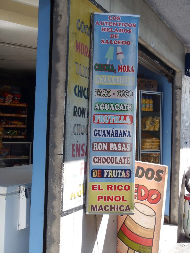En route, alors que nous étions fatigués et que la chaleur commençait à nous atteindre, nous avons fait un arrêt sur la rue principale de Salcedo ou on affiche les « Authenticos Helados del Pais » (les crèmes glacées authentiques du pays).