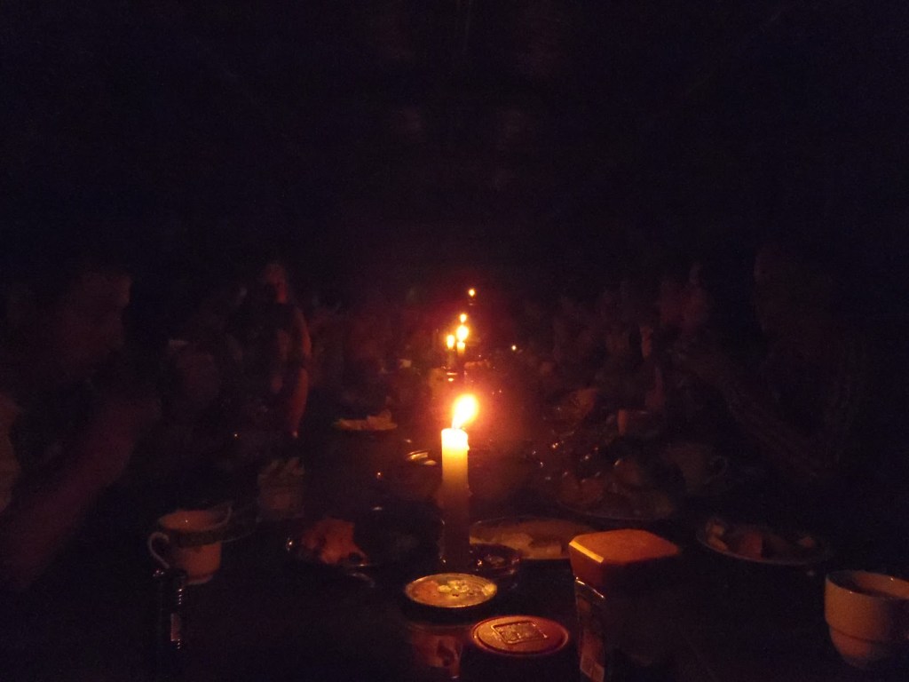 Notre salle à manger était ouverte sur l’extérieur. Nous avons eu droit à deux soupers à la chandelles puisque là-bas, il n’y a pas d’Hydro-Québec et que les génératrices font souvent défaut.