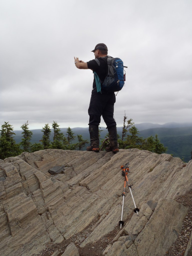 Les prochaines photos ont été prises sur le rock qui sert de sommet au mont Ernest-Ménard. Sur celle de droite, on voit Denis qui se prend pour une chèvre de montagne. S’il n’avait pas ses bottes de marches dans les pieds, ses orteils flotteraient dans le vide.