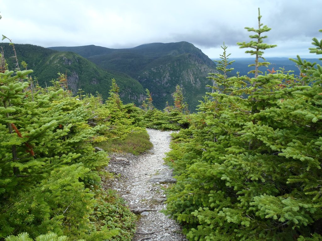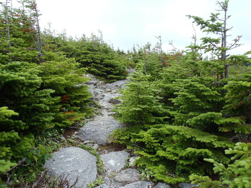 À partir de ce point, une randonnée de 3,2 kilomètres nous amenait jusqu’au Pic du Brûlé lui-même. La piste en montées et en descentes sans fin, nous oblige à faire le tour des roches et des souches. Nous devions aussi éviter les racines à fleur de sol et les pierres branlantes qui jonchent le chemin. En plus, il y avait ce petit crachin froid qui nous tombait dessus.