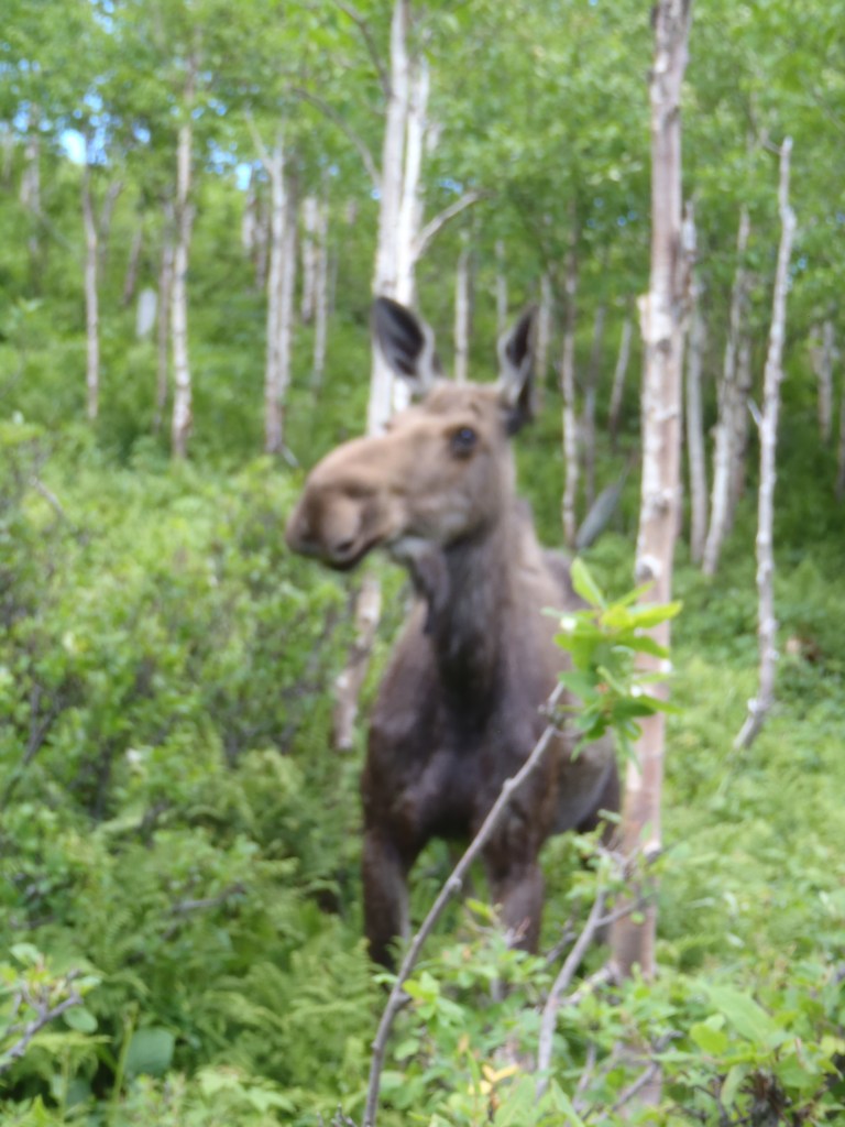 Puisqu’il fallait redescendre un jour, nous avons repris le sentier pour compléter la boucle et revenir au stationnement. En route, nous avons eu la joie de voir des orignaux de près. Ils broutaient tranquillement près de la piste, là où l’herbe est tendre et facile d’accès. Nous en avons vu plusieurs, cinq ou six, des mères avec leurs petits.