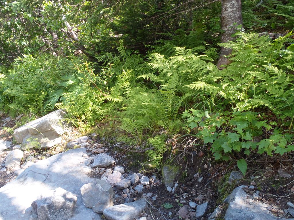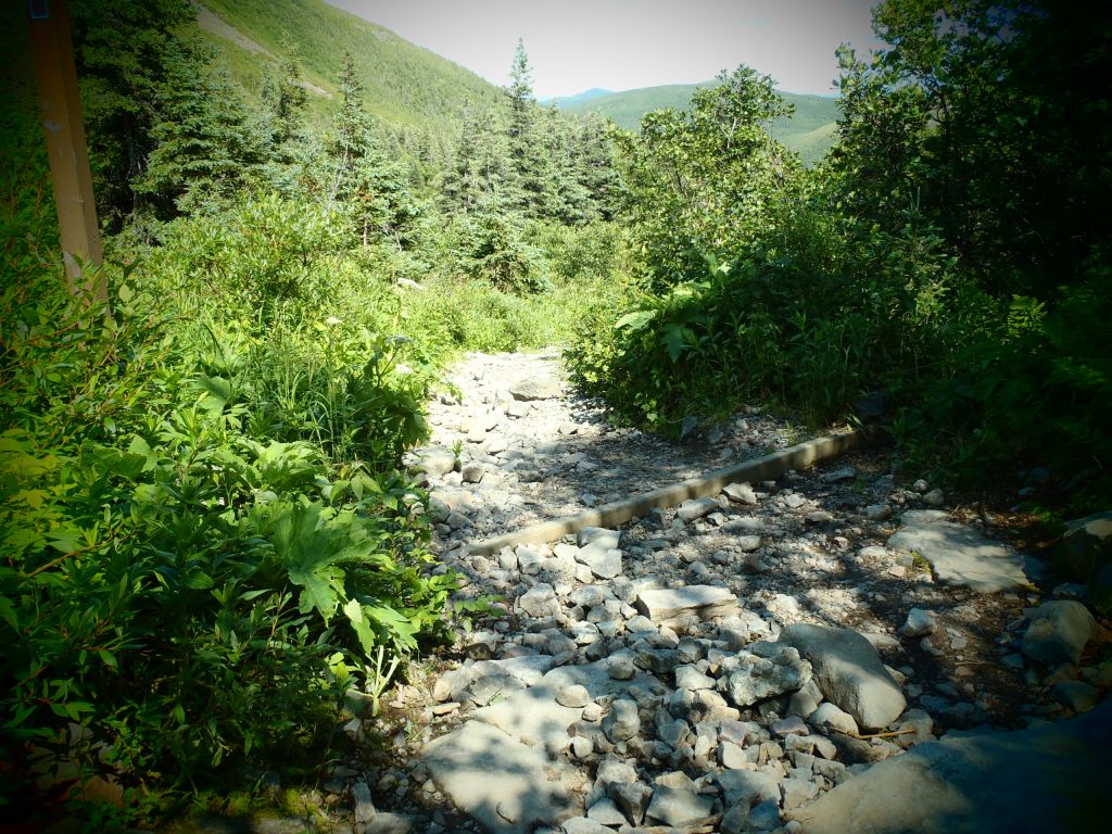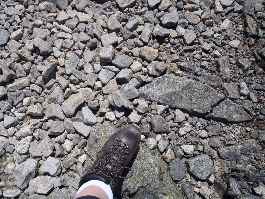 Puis, quelques centaines de mètres dans la piste, je me suis rappelée pourquoi on l’appelait « le sentier aux cailloux ». Quelque part, dans ma satisfaction d’avoir grimpé la montagne quelques fois et d’avoir savourer le plaisir d’être au sommet, j’avais oublié ce détail pourtant très important. La piste est remplie de cailloux de granites qui glissent sous les pieds et nous gardent en déséquilibre constant. Puis il y a les grosses roches qu’il faut contourner ou enjamber, ainsi que les rochers à fleurs de sol que des géants malhabiles ont sculpté en marches difficiles à monter, tant elles sont hautes, inégales et sans aucun sens de l’équerre.