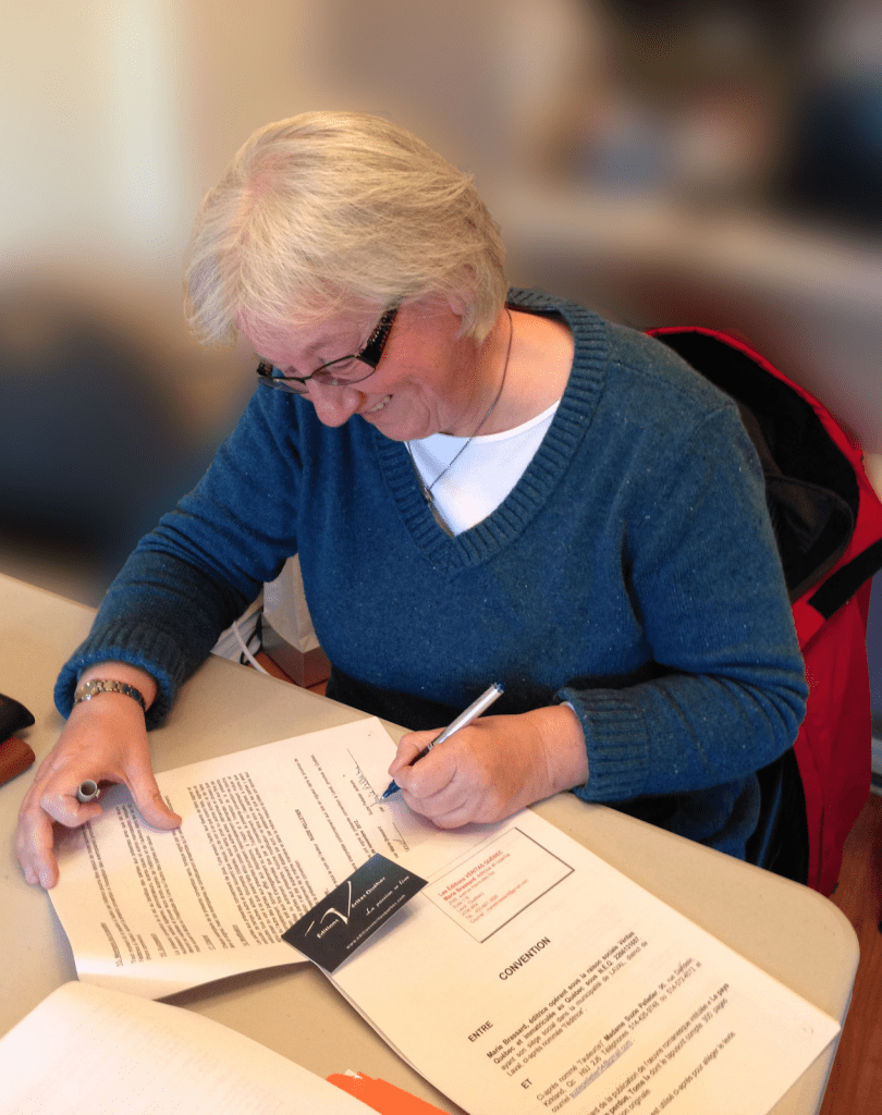 Mais je n’allais pas lâcher prise. J’ai exploré les maisons d’édition indépendantes. Elles ne sont pas subventionnées par les gouvernements, alors il faut parfois participer à la mise de fonds. En contrepartie, les droits d’auteur sont entièrement protégés. Ces maisons offrent plutôt un contrat d’édition qui s’apparente à un partenariat; j’étais conquise. J’ai senti le respect de l’auteur et de son œuvre. J’ai trouvé un monde ouvert, compétent, où la passion du livre passe avant tout. Dans le kiosque de l’Alliance des éditeurs indépendants dans les salons du livre, l’énergie circule et la camaraderie s’accompagne de rire et de tapes dans le dos. Pas de compétition malsaine. Je suis à l’aise. Auteurs et autrices, lecteurs et lectrices, tout comme les éditeurs et les éditrices y sont au rendez-vous. Les rôles sont flous, indistincts. Tous ont le même langage… celui de la passion de l’écriture.