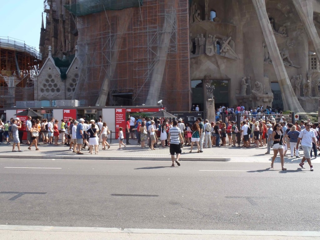 Notre première destination était, bien sûr, la Sagrada Familia et notre premier rendez-vous avec les travaux de Gaudi. C’est ainsi que notre voyage touristique a vraiment commencé. En arrivant, nous avons vu qu’il y avait beaucoup de touristes en attente. Bon ! Il aurait fallu se lever plus tôt, écourter le temps du petit-déjeuner. D’un commun accord, nous décidons de nous mettre en ligne afin de pouvoir visiter l’attraction principale de Barcelone.