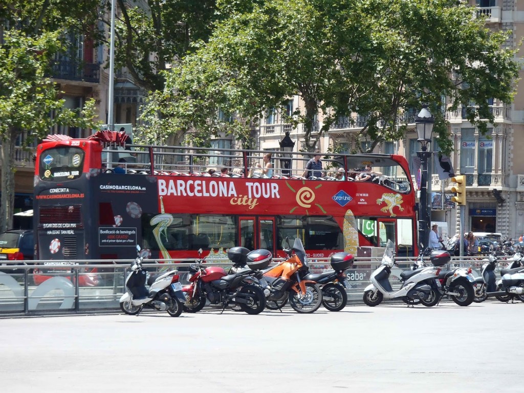 On offre deux tours de deux heures. La ligne verte nous présente le centre et l’est de la ville. La ligne orange, le centre et l’ouest de la ville. Nous n’avions pas sur notre programme de la semaine de visiter des points spécifiques dans l’ouest de la ville, alors cette sortie nous a permis de voir en deux heures ce qu’il y avait à voir et de constater qu’on reviendra sans doute un jour à Barcelone. Le seul désavantage de ces tours est que, pour bien voir, il faut s’assoir au 2e étage « ouvert » de ces autobus « double decker ». Même en prenant le premier bus de 9 h, nous avons eu chaud, car le soleil barcelonais tape fort et il n’y avait aucun nuage dans le ciel pour briser l’éclat de ses rayons. Quand on est à l’arrêt, qu’aucun vent ne vient rafraîchir l’air ni qu’aucun arbre ne jette de l’ombre, ma peau de blonde en prend tout un coup !
