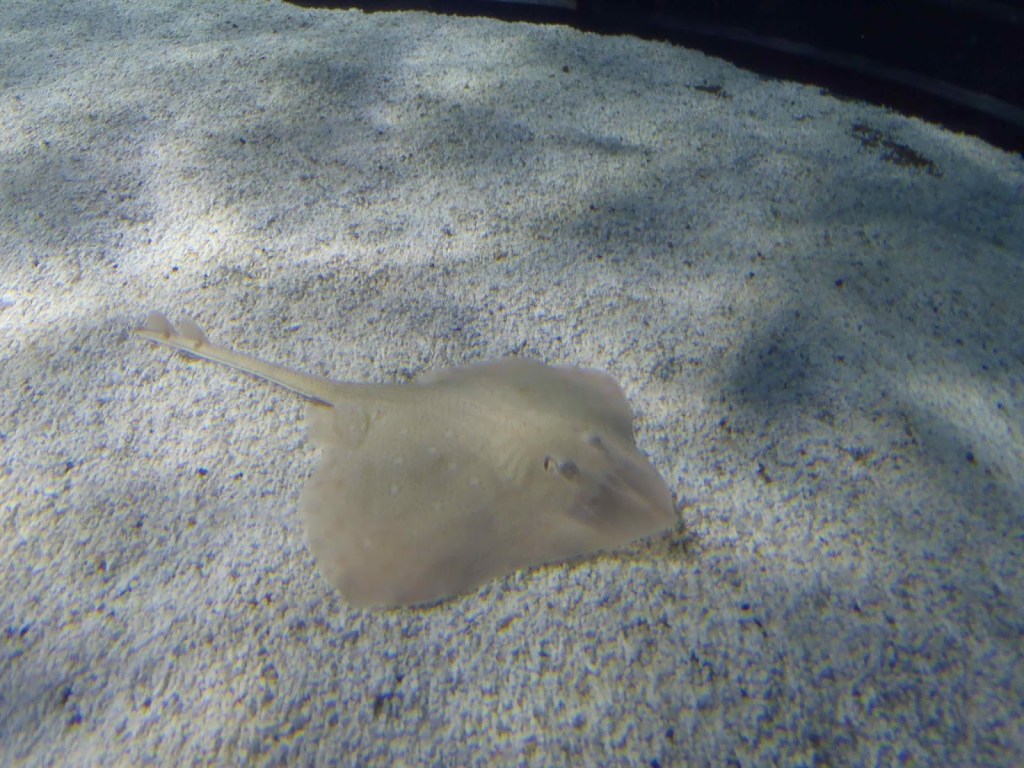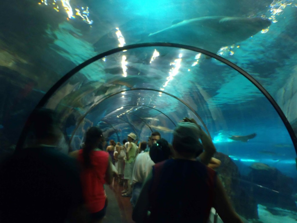 Au programme, la visite de l’Aquarium de Barcelone dont la réputation internationale n’est plus à faire. En plus des nombreux bassins où l’on peut voir des poissons provenant de tous les océans du monde, l’aquarium comprend un « océanarium ». L’immense bassin circulaire de 36 mètres de diamètres et 5 mètres de profondeur, contient 4500 m3 d’eau de mer, où circulent requins, raies et poissons en tous genres et au travers lequel on a tracé 80 mètres de tunnel transparent. Debout sur un tapis roulant, les visiteurs peuvent admirer les énormes bêtes s’approcher de tous côtés ou flotter au-dessus de la tête. Une visite qui ne valait peut-être pas les 20 € par personne, sûrement plus intéressante en famille, mais qui nous a tout de même plu. À visiter en dehors de l’achalandage touristique, surtout si vous voulez prendre des photos sans vous faire bousculer.