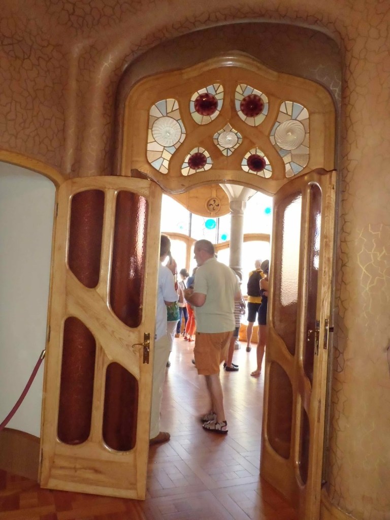 Sise sur la Passeig Gràcia, cette maison à cinq étages a été construite pour la famille Batlló, selon les plans de l’architecte et artiste Antonio Gaudi. Le thème : la mer. En rapport avec les mouvements de l’océan, aucun mur n’est vraiment droit. Les portes et les fenêtres rappellent les mouvements des vagues alors que les décorations, que ce soit une balustrade, le papier peint ou les lampadaires imitent la forme de la vie marine, incluant les monstres marins qu’on se représentait à l’époque. Vous trouverez, ci-après, quelques photos représentatives. Remarquez l’utilisation de la couleur bleue, qui rappelle la mer, et du bois qui souligne le lien avec les bateaux de l’époque.