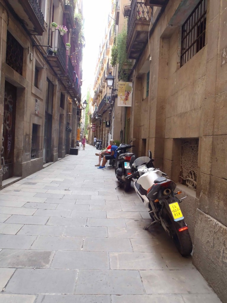 Par contre, nous avons découvert un ensemble de rues aux noms difficilement prononçables, ce qui nous fait observer, encore une fois, le caractère distinctif du Catalan, cette langue chantante que Franco a tenté de faire disparaître, heureusement sans succès. Ces noms de rues représentent des métiers d’artisans, comme ils se sont installés, en dehors des murs de la ville médiévale, sur la fin du XIIIe siècle et le XIVe siècle. Les rues étroites ne devraient être que piétonnières, mais on s’y fait bousculer par les vélos et les motos.