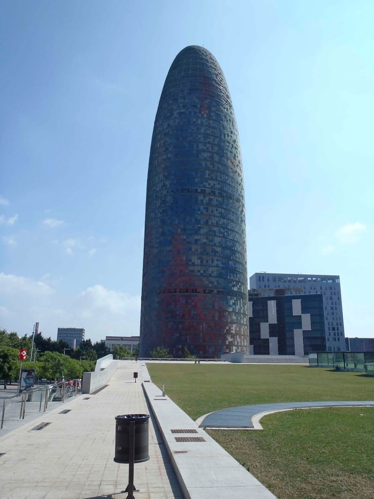 Nous étions doncà deux pas de notre premier centre d’intérêt, ce que les Barcelonais appellent le « Cigar bleu vertical », la très controversée Torre Agdar. Il s’agit d’une tour à bureaux construite pour la compagnie des eaux de Barcelone par l’architecte français, Jean Nouvel.