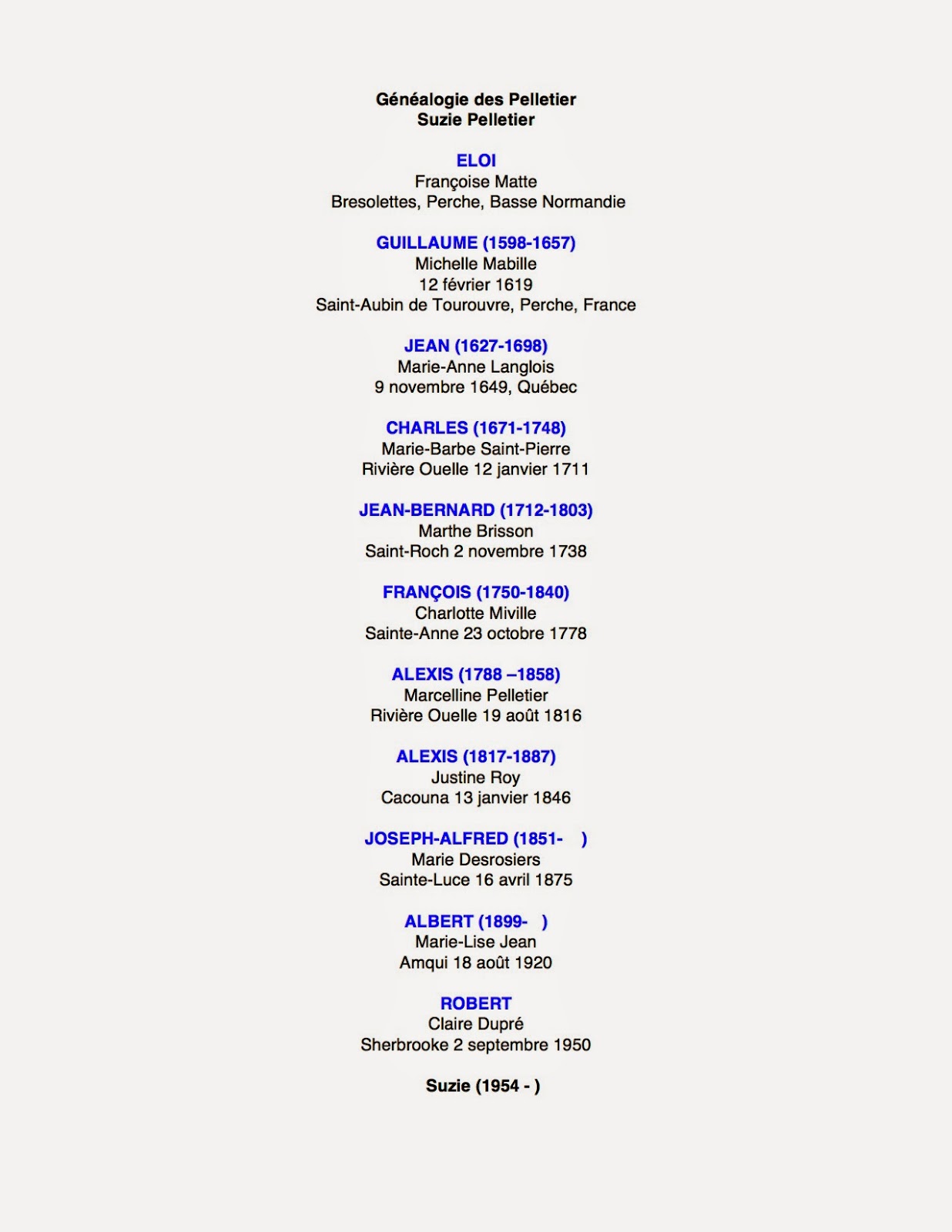 J’ai aussi trouvé les informations qui me permettaient de valider ma généalogie. Je descends bien de Jean Pelletier, arrivé en 1641. Voici ma lignée d’ascendance.