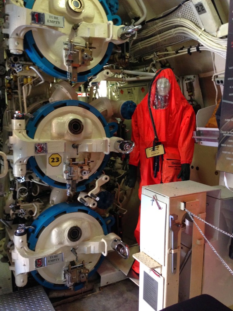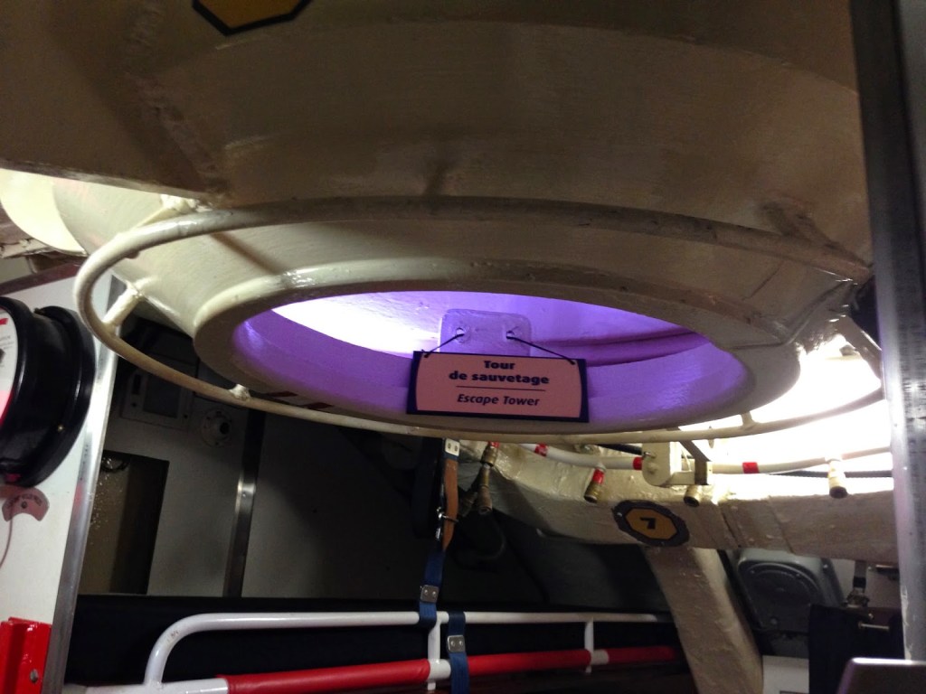 U peu plus loin, je lis « tour de sauvetage ». J’écoute l’audioguide. OK! Ce trou vers le haut, là, c’est la sortie de secours du sous-marin.