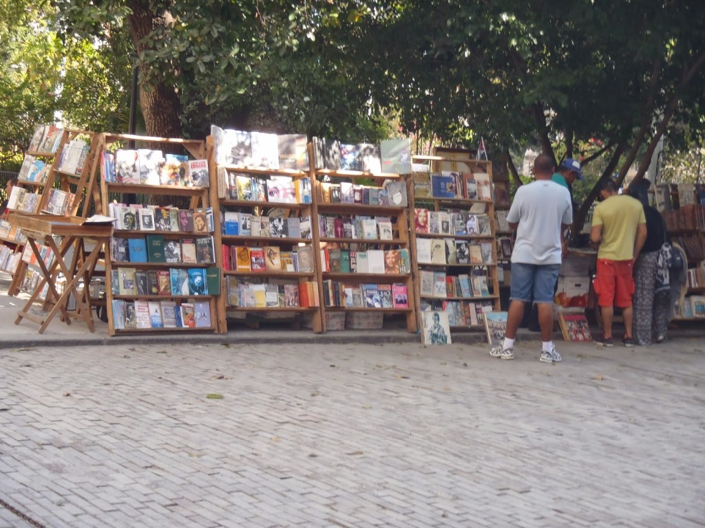 Adorant respirer l’air des librairies et des bibliothèques, j’ai trouvé le bonheur en examinant tous ces rayons disposés dehors. Bien sûr, il y avait cette odeur de tabac, de rhum et de poubelle qui flottaient, mais ils ne couvraient pas complètement l’effluve du vieux papier où se traçaient des lettres à l’encre…
