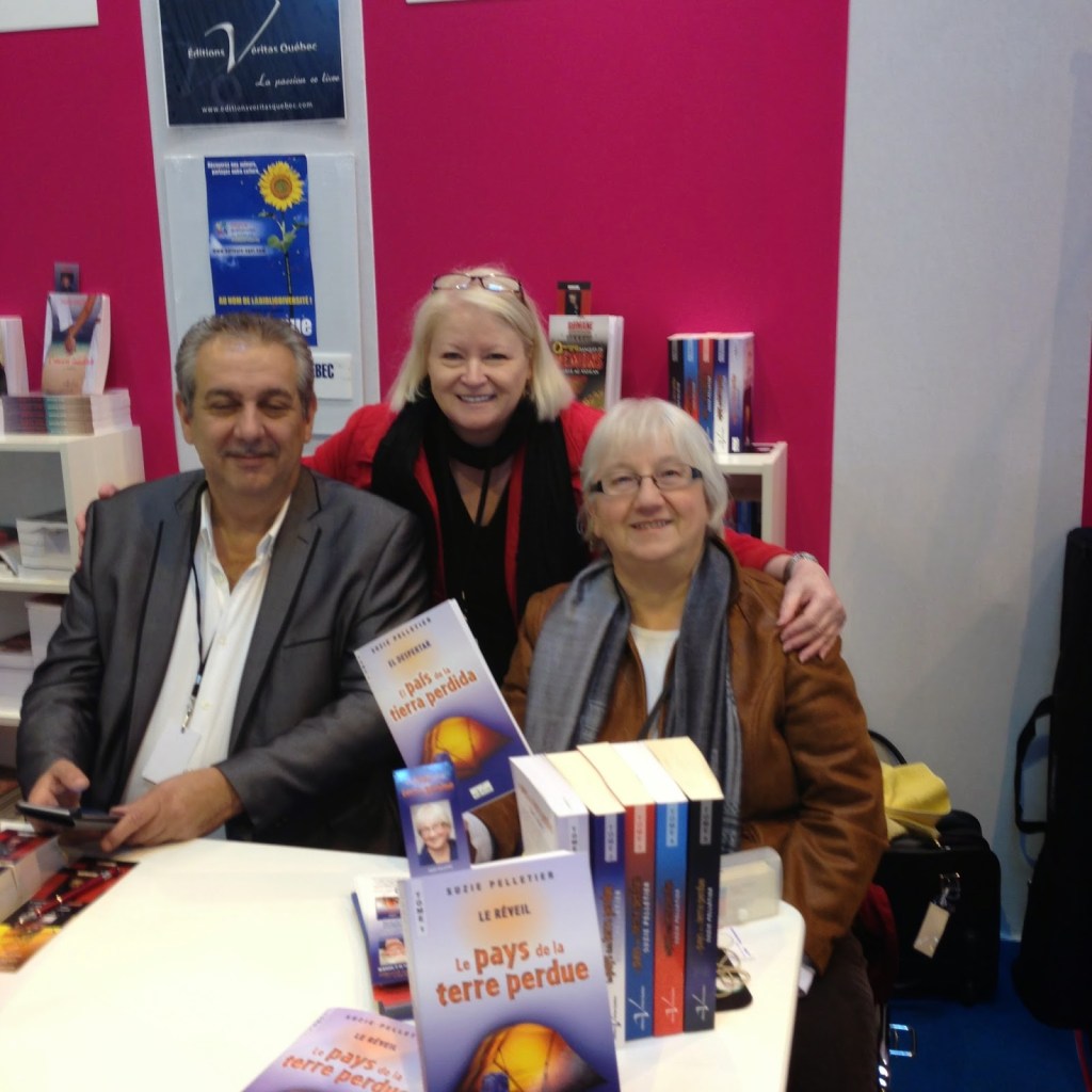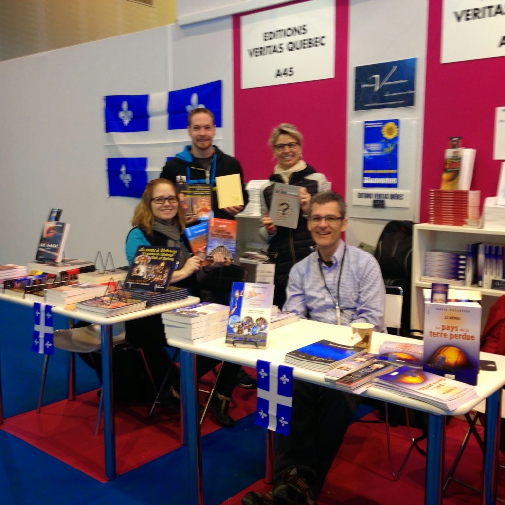 De droite à gauche, on me retrouve avec ma collection « Le Pays de la Terre perdue », Marie Brassard, l’éditrice de Véritas Québec, par qui notre présence à Paris est possible, et Romane, l’auteur de « Banque de démons, alerte au Vatican ».