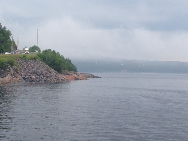 Le trajet entre l’Auberge des peupliers de Cap-à-l’Aigle (La Malbaie) et le quai de Baie-Sainte-Catherine ne dure que 50 minutes. Ici, loin du capharnaüm de Montréal les détours pour les travaux routiers ne ralentissent pas notre voyage de plus de quelques minutes à la fois. Il ne pleuvait plus à notre arrivée et les indices d’orages violents prévus par météomédia ne se matérialisaient pas, à notre grand bonheur. Les nuages sont bas et le brouillard enveloppe le fleuve.