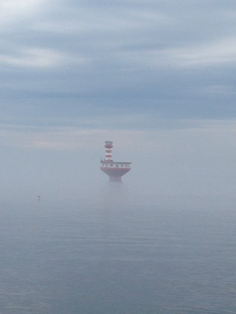 Soudain, le phare qui marque le milieu de la voie maritime du Saint-Laurent sort subitement du brouillard pour tenter de nous impressionner.