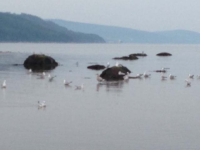La journée était humide et le soleil se cachait derrière de gros nuages. Par contre, comme c’est toujours le cas quand nous voyageons, nous faisons fi des soubresauts atmosphériques, préférant plutôt nous imprégnez de la beauté des lieux selon les circonstances. Cette fois, le fleuve calme avait retiré ses eaux pour nous permettre de marcher un bout de temps entre les roches, sur les dunes et à proximité des goélands tranquilles. Même si le temps était gris, nous avons apprécié la paix des lieux.