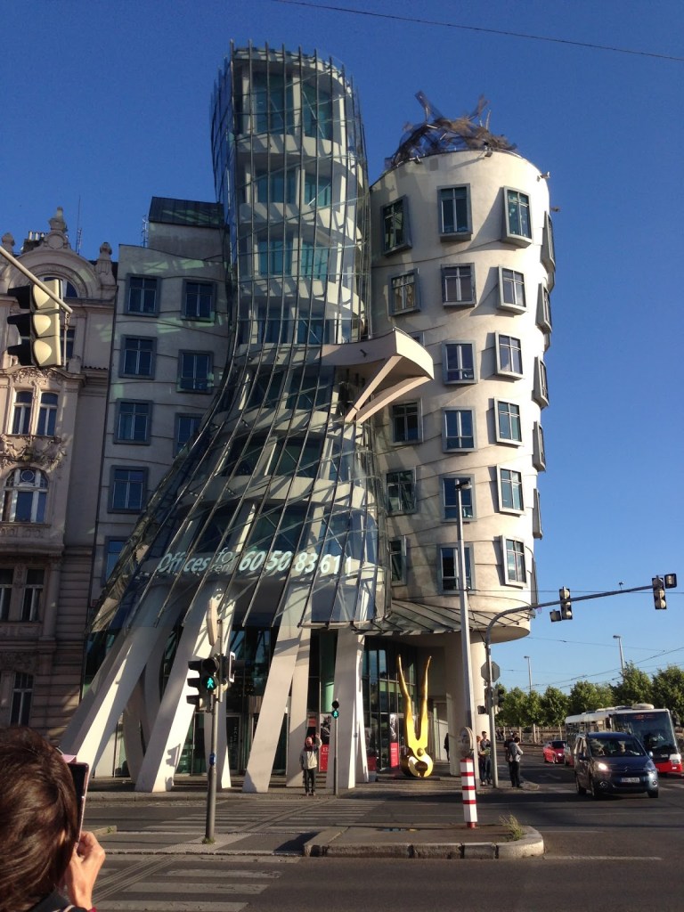 Nous voulions prendre des photos de la Tancící dǔm (maison dansante). Construite de 1992 à 1996 par Vlado Milunic et Frank Gehry, la bâtisse représente deux danseurs enlacés. Moi, je pense que les constructeurs avaient trop bu !