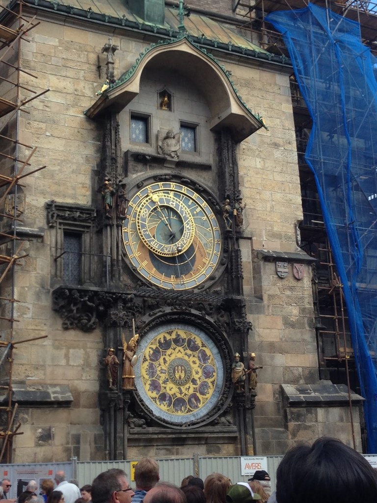 Comme nous approchions l’heure, nous avons voulu voir le spectacle qu’offre l’horloge astronomique géante. La tour de 69,5 m qui la soutient a été construite en 1364. En 1410, l’horloger de l’empereur, Mikulăs of Kadaň, a créé le mécanisme de la Prague Orloj. Il fallut attendre 1552 pour qu’on nomme Jan Taborský en charge de sa construction.