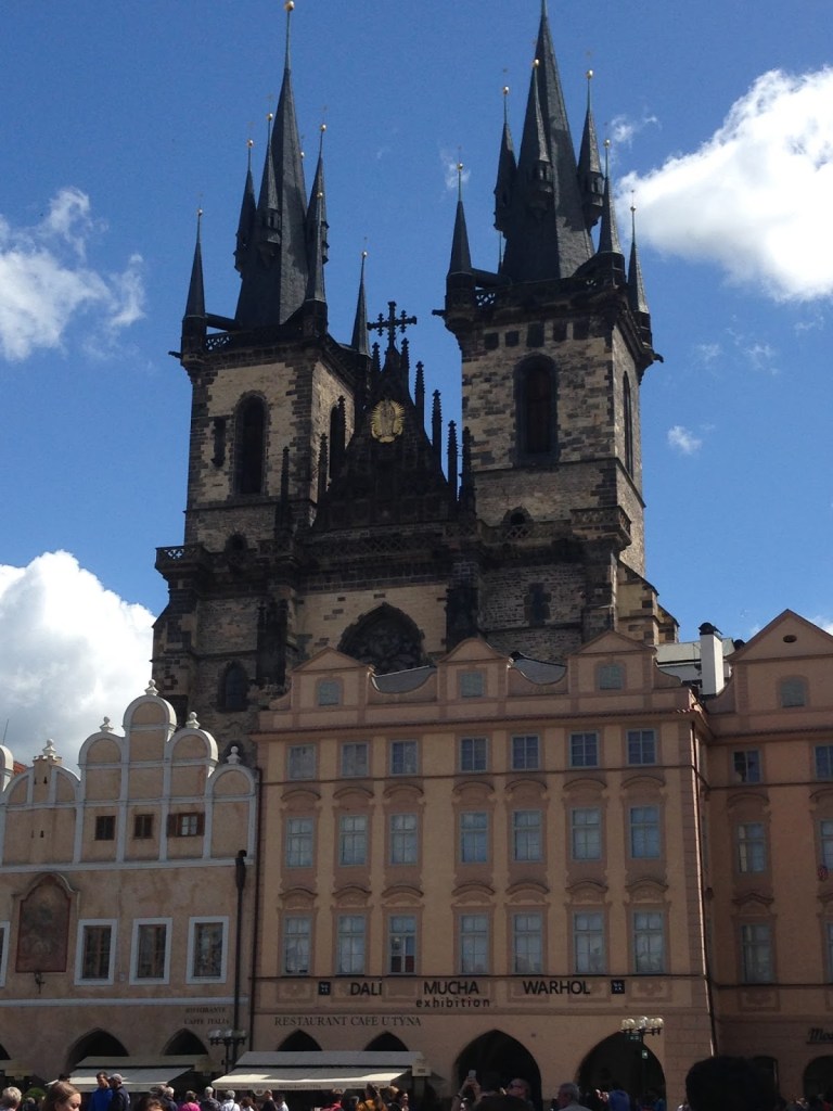 Puis, il fallait compter sur Denis pour faire le tour de l’Église Chrám Matky Boží před Týnem (Vierge Marie sur le Tyn), puis revenir dans le carré central pour y découvrir la porte d’entrée principale. Bravo ! Déçu de ne pouvoir prendre des photos, il a quand même fait le tour lentement pour en voir tous les détails.