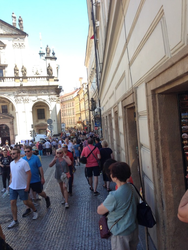Málostranská. Pour le simple plaisir de marcher dans la vieille ville, nous traversons le Danube en empruntant le pont piétonnier Charles. À l’approche de cette place hautement touristique, nous remarquons l’achalandage.