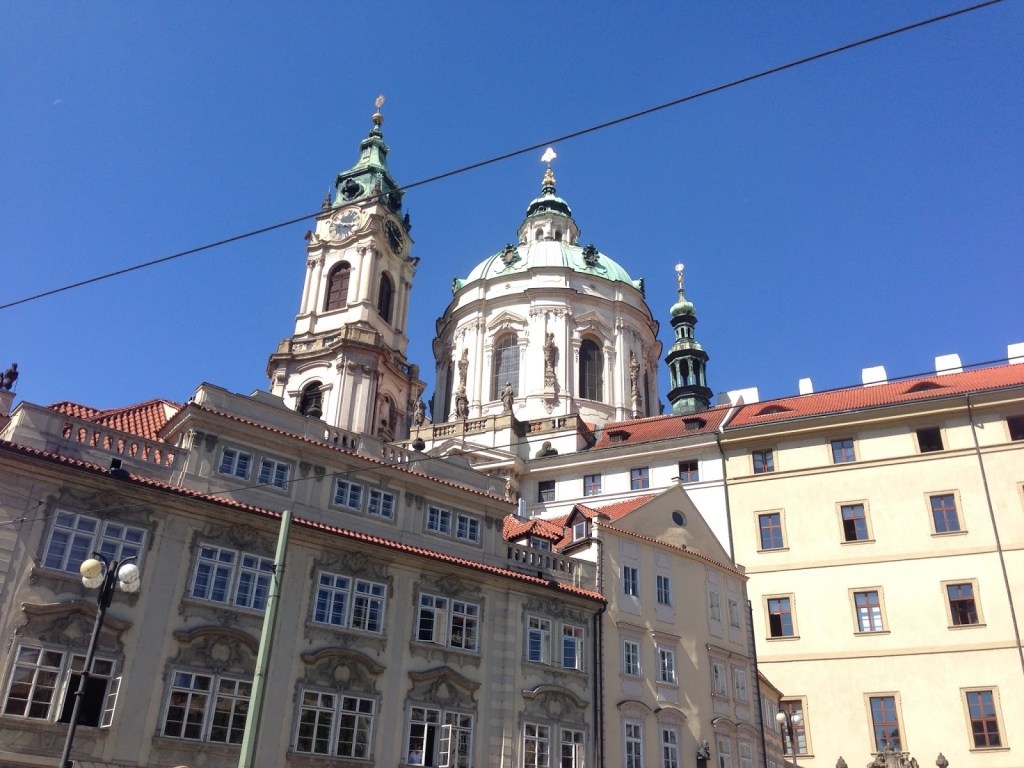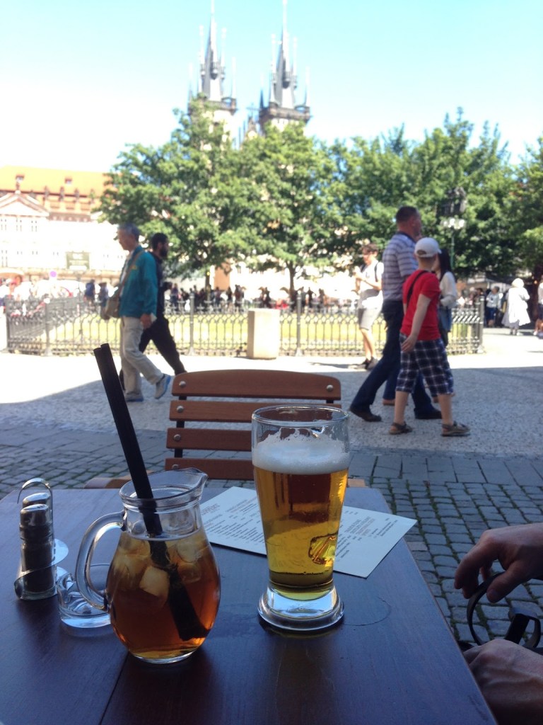 nous a fait nous arrêter au carré Staroméstské, en face de l’église Saint-Nicholas (celle-ci porte un « H » dans son nom), pour un thé glacé (pour moi) et une bière (pour Denis). Comment ne pas apprécié le moment magique alors que les tours de l’Église Saint-Mary of Tyn ressortent derrière les arbres ? Un instant mémorable !