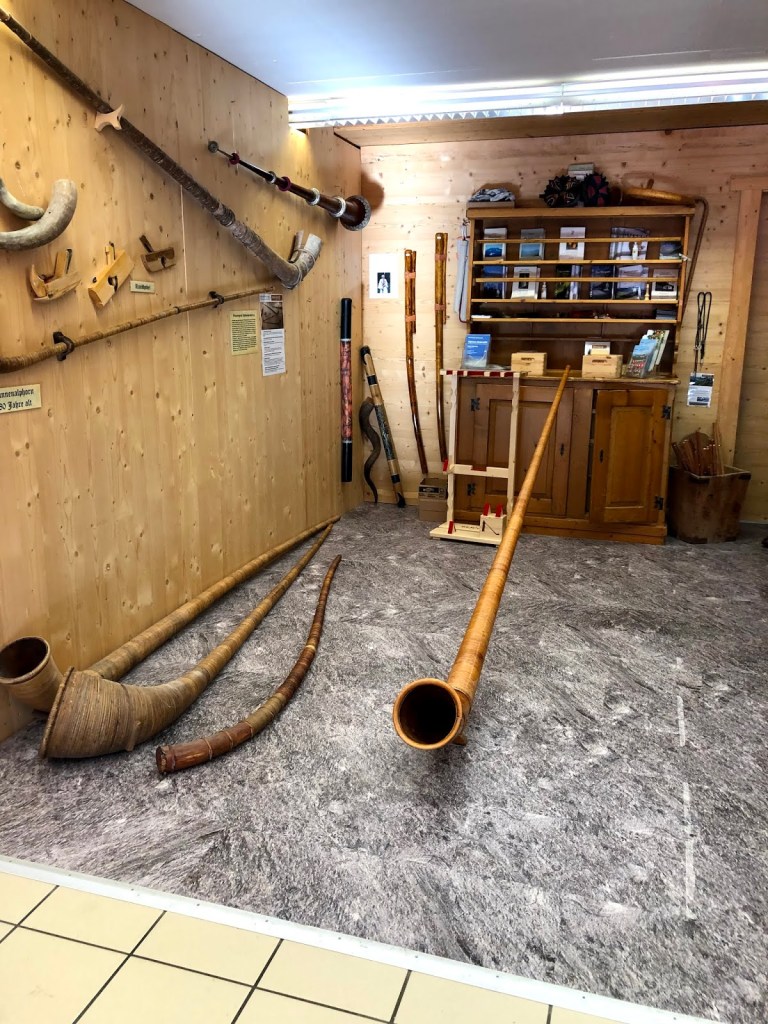 Ces routes en lacets titillent mon sens du vertige, mais je le fais taire pour mieux profiter des paysages merveilleux que ces bouts de chemin nous font connaître. Nous nous rendons à Habkern pour visiter une fabrique de cor alpin et une boutique de musique, la Bernatone Alphornbau, menée de mains de maître par Heinz et Marietta Tschiemer.