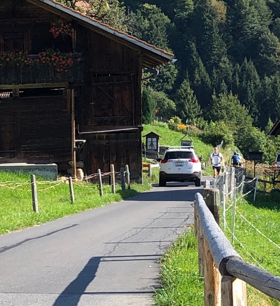 Quand on voit l’auto s’éloigner, on ne peut pas faire autrement que se demander par quelle rue du village ces gens reviendrons. On observe un bout de temps pour analyser et bien comprendre. Puis c’est la surprise ! La rue va dans les deux sens ! Ce véhicule orange s’en vient vers nous ! Il faut donc attendre son tour ! Il sont patients ces Suisses !