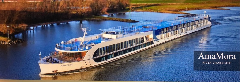 L’AmaMora a été terminé en 2019. Il est long de 443 pieds et large de 38 pieds. Il comprend 51 membres d’équipage et peut accueillir 156 passagers. En fait, l’AmaMora est un bateau fluvial, une sorte de péniche longue, sophistiquée, moderne, climatisée. Son pont supérieur comprend la timonerie bien sûr, mais aussi une piste de course, une piscine, et de nombreux parterres où l’on peut relaxer, observer le fleuve ou une manœuvre de navigation, jaser avec des amis, ou prendre un verre.