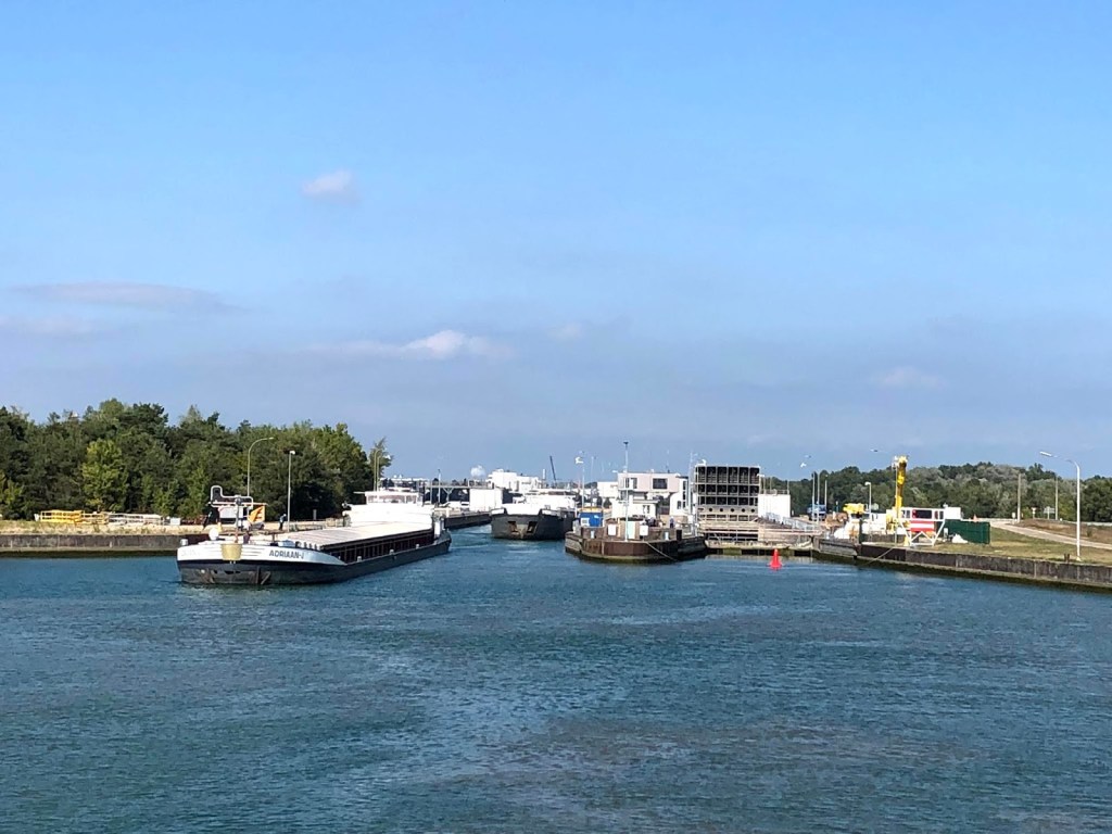 Ici, nous attendons que deux autres péniches sortent de l’écluse afin de poursuivre leur voyage en amont (Direction de Bâle).