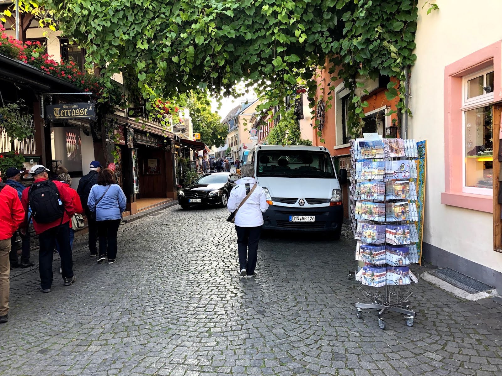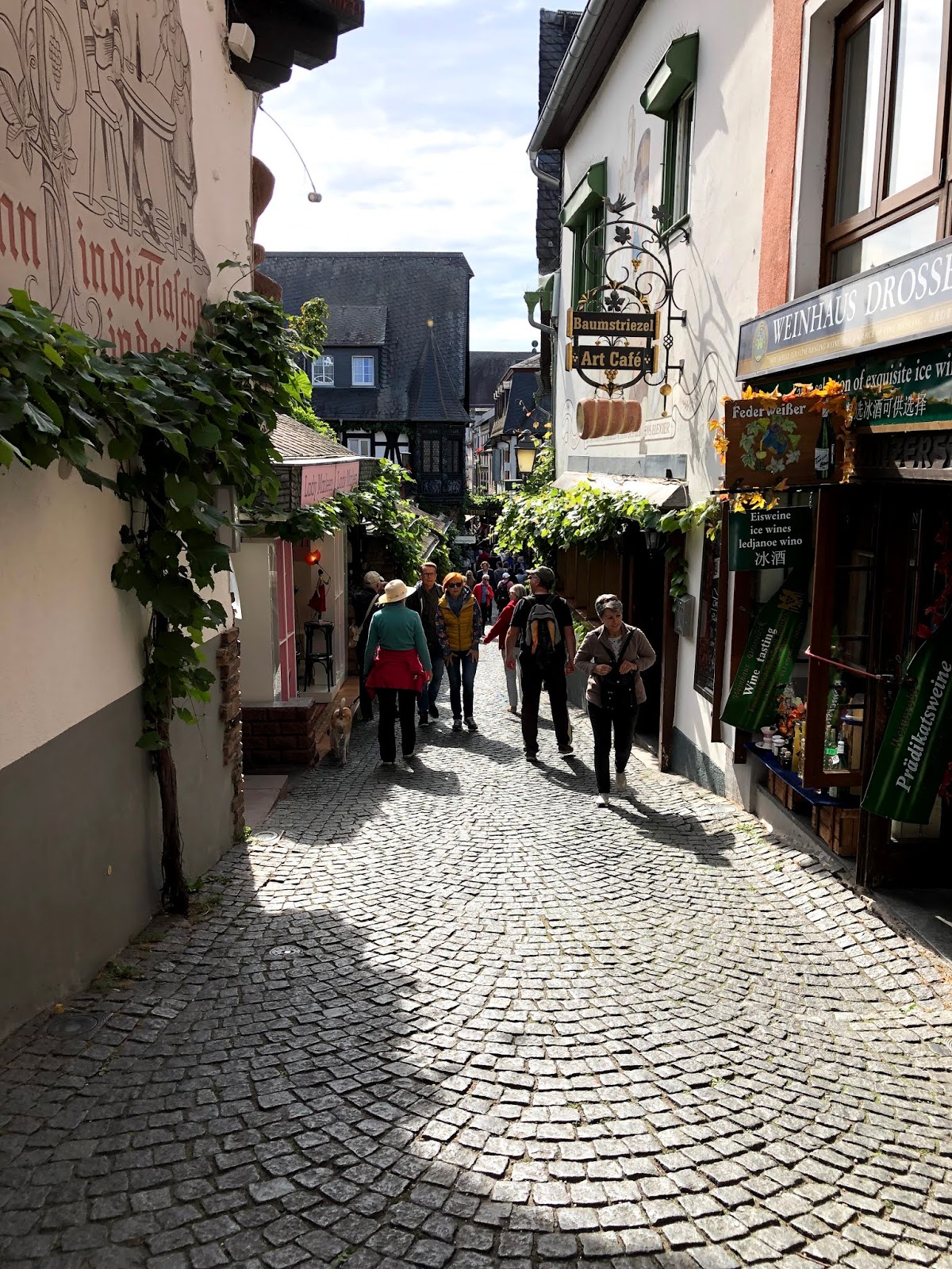 Puis, un temps libre nous le permettant, nous avons déambulé dans la partie piétonnière de la ville, sur la rue Oberstrasse ou la Drosselgasse. On y trouve des centres de dégustation du vin de la région, le Riesling, la boutique de Noël, des boutiques de souvenirs en tous genres et plusieurs restaurants.