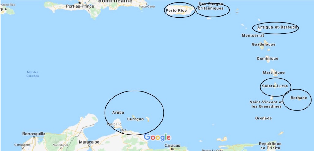 Ce voyage nous fera visiter plusieurs îles de la région des Caraïbes situées le plus à l’est. Nous serons dans les Petites Antilles qui s’éparpillent entre Puerto Rico et le Venezuela. D’ailleurs, cette région se subdivise entre les îles du Vent, celles qui sont à la limite des Caraïbes et de l’Atlantique, dont Sainte-Lucie et Saint-Christophe-et-Niévès. Les îles d’Aruba, Curaçao et Bonaire font partie des îles sous le vent, plus à l’ouest et plus près du Venezuela.