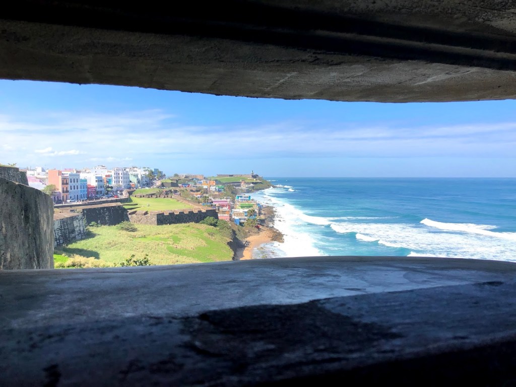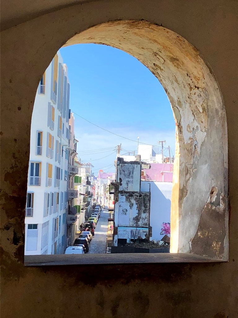 Aujourd’hui, nous avons visité la vieille ville de San Juan. Un taxi nous a conduits jusqu’à la Plaza de Colón, tout près de la forteresse de San Cristobal que nous nous sommes empressés de visiter. Par les photos qui suivent, vous comprendrez que je me suis plus amusée à regarder dehors qu’à l’intérieur. Après tout, un fort est un arrangement de bloc de pierres, peu importe où on se trouve dans le monde. Je trouvais plus intéressant de comprendre que cette forteresse ancienne se trouvait dans le décor d’une ville très moderne. Elle possède une place de choix dans la ville et dans le coeur de ses habitants.