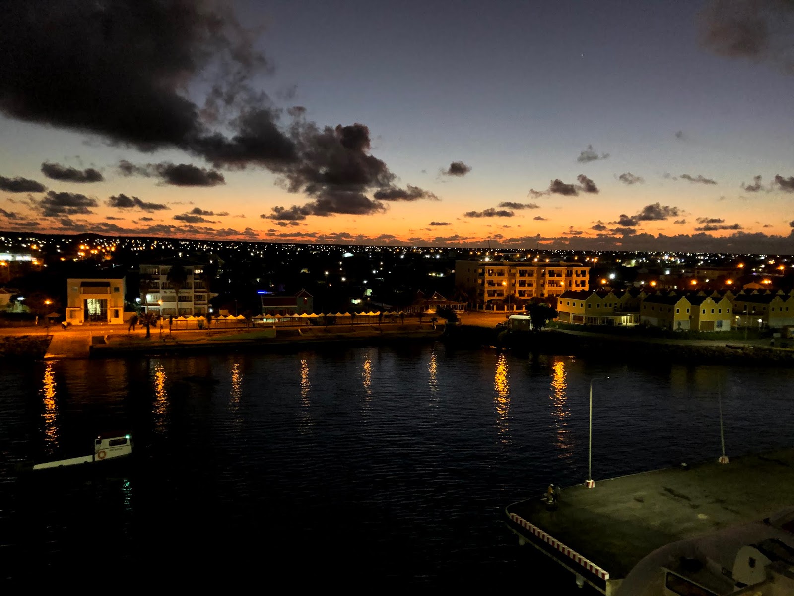 Voici un magnifique lever de soleil sur la ville de Kralendijk. Profitez-en ! Il est possible que ce soit le dernier du voyage. En effet, à partir d’aujourd’hui, nous reprenons la direction de nord. Notre prochaine destination, Sainte-Lucie, nous fait voyager en direction nord-est. Or notre cabine est à tribord et nous verrons plus les couchers de soleil…