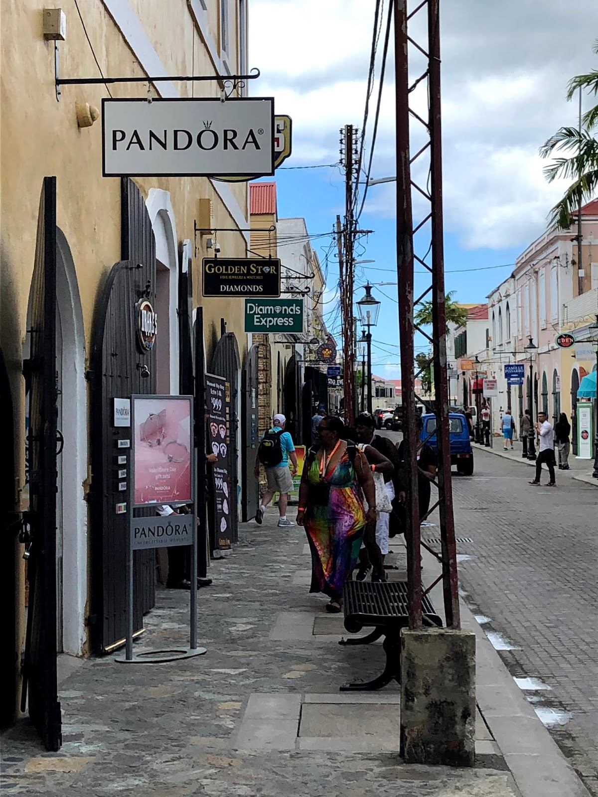 Aujourd’hui, nous avons marché les trois kilomètres qui séparent le port de la ville elle-même. Puis nous avons déambulé dans les rues où presque tous les magasins tentent de vous vendre des bijoux. Ici, il n’y a pas de frais de douane à payer pour les gens qui arrivent par bateau de croisière. Pourquoi ne pas acheter un diamant ? Deux ou trois peut-être ? Pour les Américains, qui n’ont aucune limite d’importation personnelle, c’est certainement une aubaine.