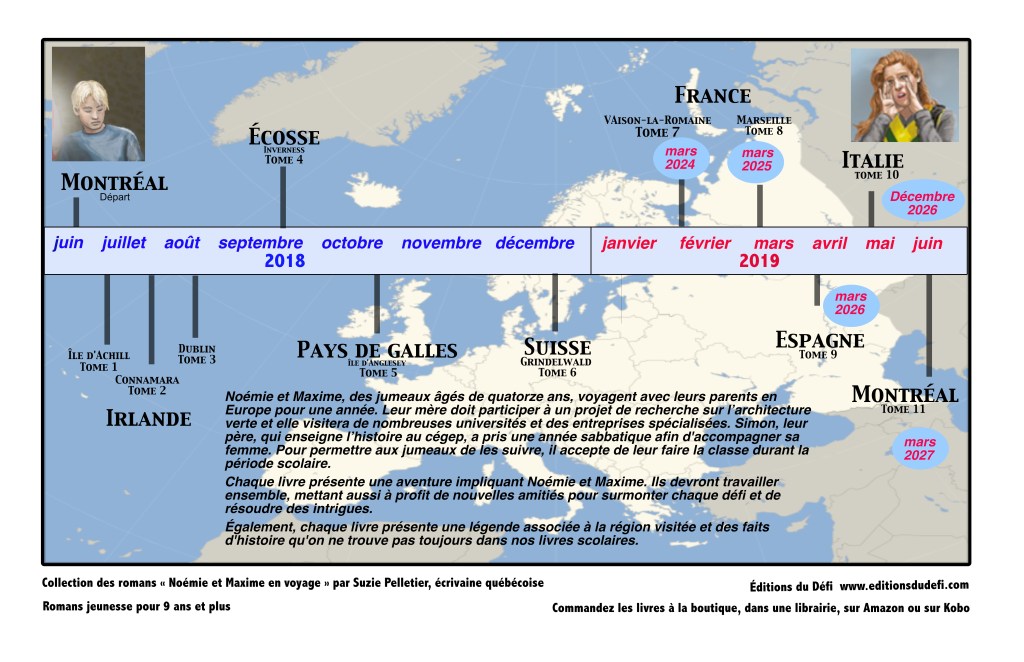 L’idée est de faire voyager la famille Fournier-Turcotte durant une année en Europe, dans les endroits que je connais bien et qui m’ont fascinée. La mère, Isabelle, architecte, travaille sur un projet qui l’amène à visiter plusieurs endroits en Europe. Le père, Simon, professeur d’histoire au cégep, prend une année sabbatique pour suivre son épouse avec leurs enfants. Il enseignera à Noémie et Maxime, des jumeaux de 14 ans, durant la période scolaire qui commence avec le tome 4.