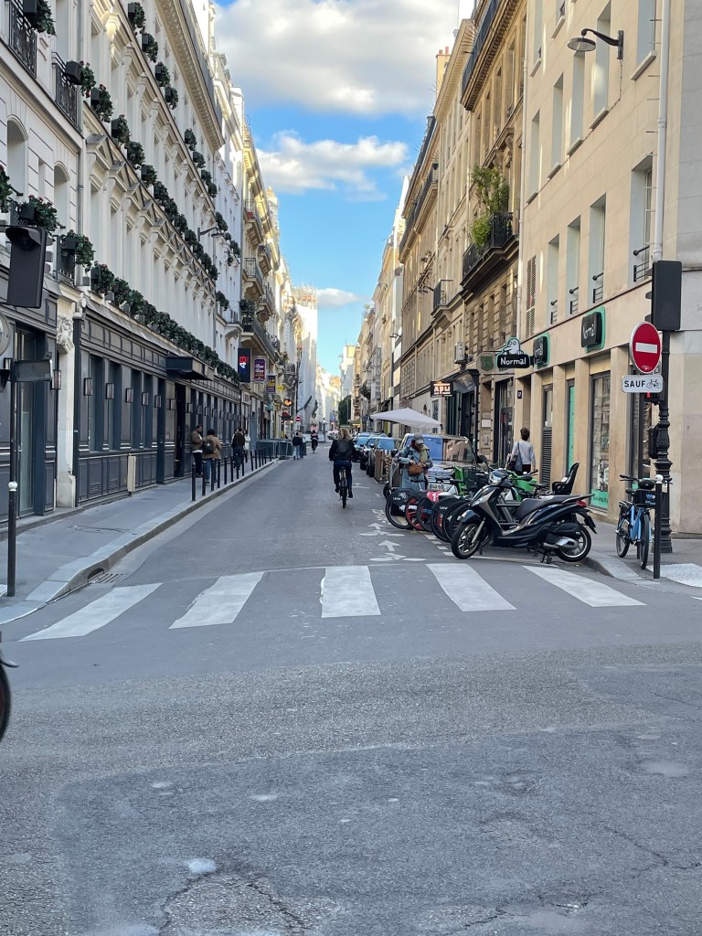 À notre arrivée à l’hôtel, notre chauffeur nous met en garde : « Attention aux vélos ! » En effet, dans les rues remodelées de Montmartre, la ville a aménagé des pistes cyclables entre le large trottoir et les voies pour les automobiles. Le chauffeur stationne son véhicule à la gauche de la piste cyclable… que nous devrons traverser pour nous rendre à notre hôtel ! Ces conducteurs ne sont pas plus gentils que ceux derrière le volant des autos ! Et merde ! Tenant fermement ma valise à roulettes, je jette un coup d’œil à ma droite. Trois vélos et une trottinette électrique filent devant moi sans s’arrêter et frôlent mes genoux. D’autres les suivent de près sans s’occuper de nous. Soudain, un espace entre deux groupes de cyclistes me permet de traverser… à la course !